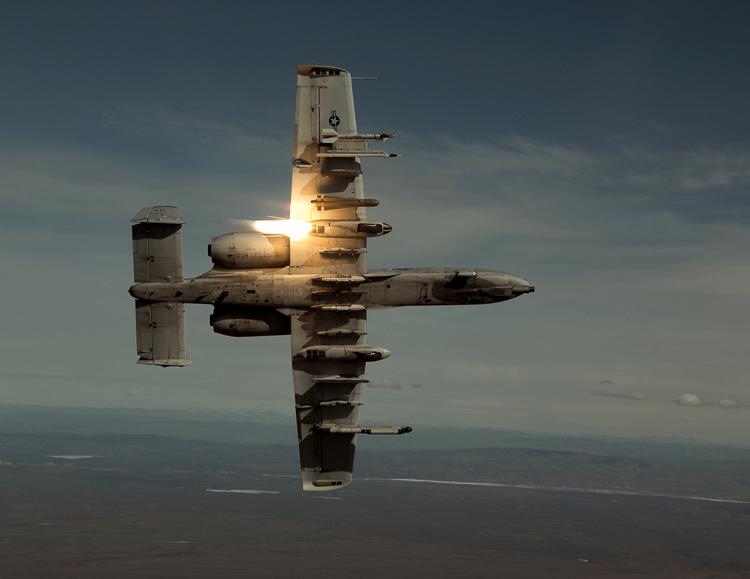 An A-10 Thunderbolt II, like this one, performs sorties daily providing top cover for ground forces in Southwest Asia. A-10s provide close-air support and employ a wide variety of conventional munitions, including general purpose bombs, cluster bombs units and laser guided bombs. (U.S. Air Force photo/Master Sgt. Robert Wieland)
