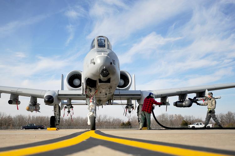 Dewayne Magnuson and Senior Airman James White work together to perform a hot pit refuel on an A-10 Thunderbolt II Dec. 8, 2010, at Whiteman Air Force Base, Mo. The Air Force Reserve Command’s 442nd Fighter Wing crews are practicing this procedure to keep their skills sharp. Mr Magnuson is an air reserve technician with the 442nd FW and Airman White is a fuels operator with the 509th Logistics Readiness Squadron. (U.S. Air Force photo/Senior Airman Kenny Holston)