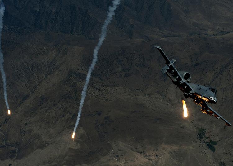 Capt. Antonio Massara deploys flares from an A-10 Thunderbolt II July 25, 2013, during a mission over Southwest Asia. Massara is assigned to the 74th Expeditionary Fighter Squadron. (U.S. Air Force photo/Staff Sgt. Robert Barnett)