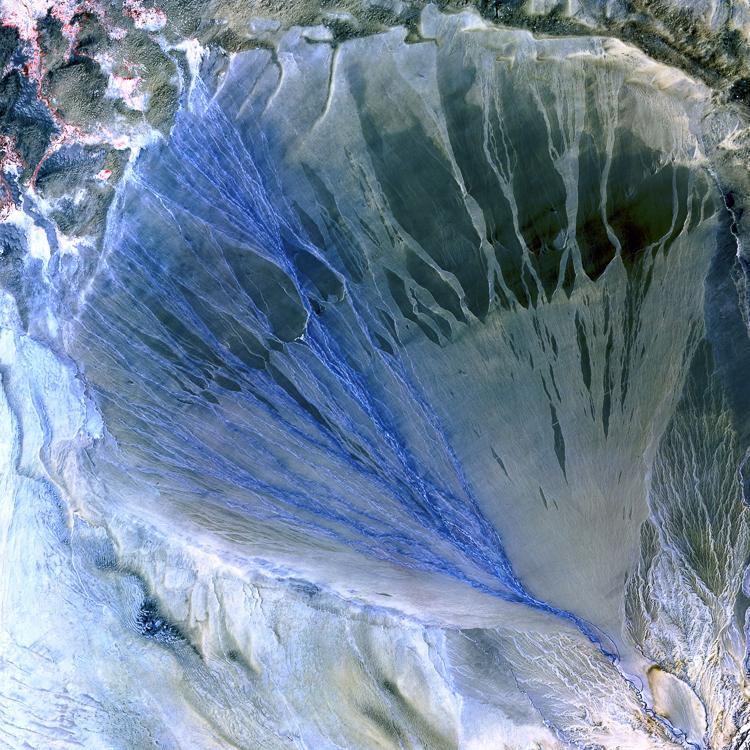 A vast alluvial fan blossoms across the desolate landscape between the Kunlun and Altun mountain ranges that form the southern border of the Taklimakan Desert in China’s XinJiang Province. The left side is the active part of the fan, and appears blue from water currently flowing in the many small streams.