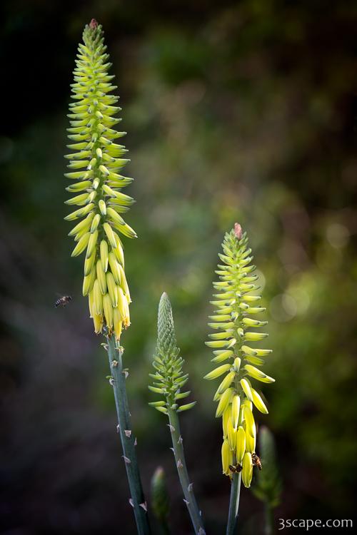 Aloe vera is a stemless or very short-stemmed plant growing to 24–39 in. tall, spreading by offsets. The leaves are thick and fleshy, green to grey-green, with some varieties showing white flecks on their upper and lower stem surfaces. The margin of the leaf is serrated and has small white teeth. The flowers are produced in summer on a spike up to 35 in tall, each flower being pendulous, with a yellow tubular corolla 1 in long. Like other Aloe species, Aloe vera forms arbuscular mycorrhiza, a symbiosis that allows the plant better access to mineral nutrients in soil.