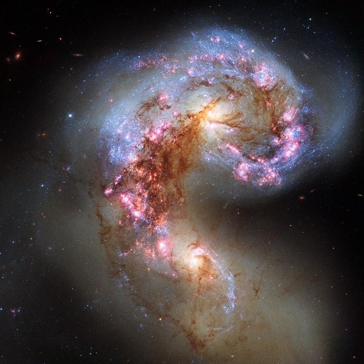 This Hubble image of the Antennae galaxies is the sharpest yet of this merging pair of galaxies. As the two galaxies smash together, billions of stars are born, mostly in groups and clusters of stars. The brightest and most compact of these are called super star clusters. The collision, which began more than 100 million years ago and is still occurring, has triggered the formation of millions of stars in clouds of dusts and gas in the galaxies. The most massive of these young stars have already sped through their evolution in a few million years and exploded as supernovas.