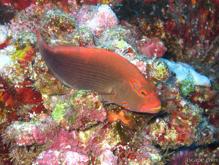 Picture of Arc eye hawkfish sitting on coral in gallery Maui Scuba Diving - Lanai.