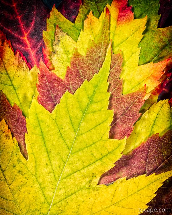 A wide variety of colors on leaves all from same Sugar Maple tree.