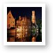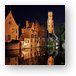 The illuminated Belfort in Brugge, Belgium at night with River Djiver in foreground.