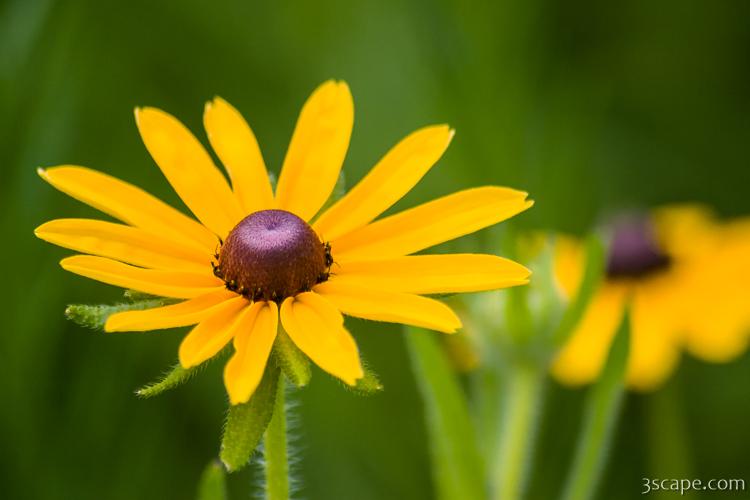 Macro of single black-eyed susan flower and green background.