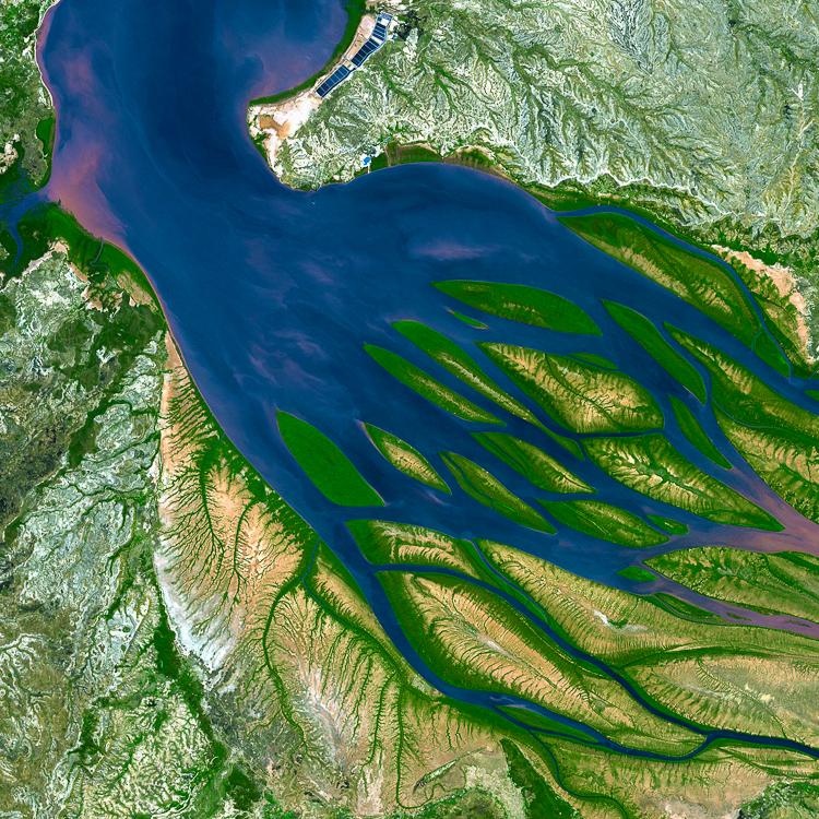 On the northwestern coast of Madagascar, the salty waters of the Mozambique Channel penetrate inland to join with the freshwater outflow of the Betsiboka River, forming Bombetoka Bay. Numerous islands and sandbars have formed in the estuary from the large amount of sediment carried in by the Betsiboka River and have been shaped by the flow of the river and the push and pull of tides.