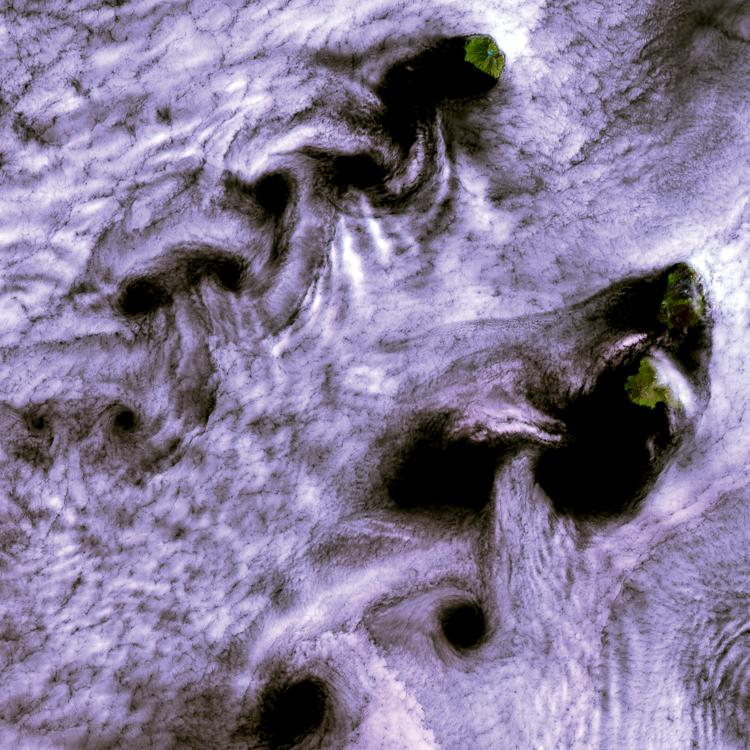 These Karman vortices formed over the islands of Broutona, Chirpoy, and Brat Chirpoyev (Chirpoy’s Brother), all part of the Kuril Island chain found between Russia's Kamchatka Peninsula and Japan.