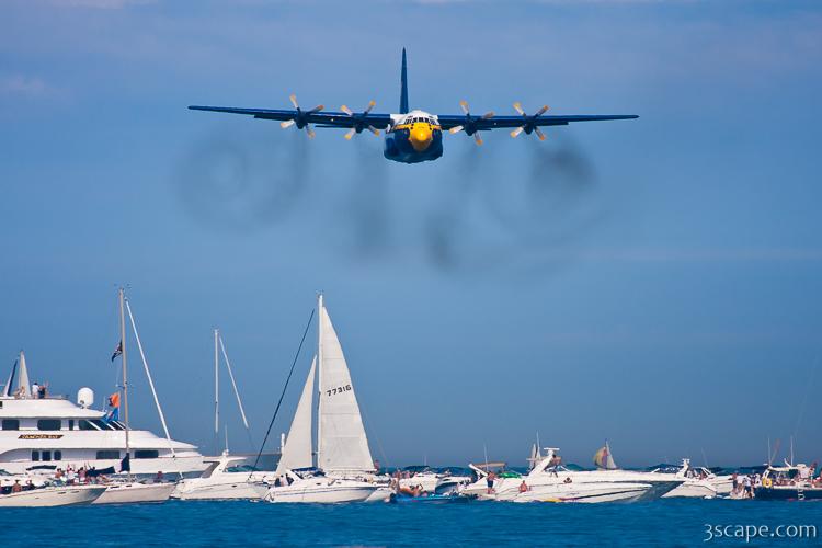 The Blue Angels C-130T Hercules transport aircraft flies low over crowded Lake Michigan as an opener to the main even at the 2010 Chicago Air Show.