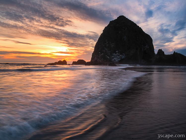 The coast of Oregon is rugged and beautiful, and many an evening can be spent walking along the beaches, exploring tide pools that team with life, or just kicking back and enjoying a glorious sunset. This spot in particular, in Cannon Beach, is especially popular for tourists and photographers. It's a real challenge to create an image that is compelling and peaceful, without being over-run with people. To create this image, I reached into my bag of tricks and pulled out a long exposure. A neutral density filter helped extend my exposure time, so that the water smoothed, and the people largely blurred away.
