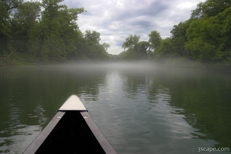 Canoeing into the morning fog on the Eleven Point River in the Ozarks of Missouri. This is a great area for peaceful river drifting while taking in the scenery.