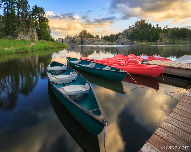 Peaceful lakeside scene featuring vibrant canoes and kayaks moored, surrounded by nature with tranquil waters and a golden sunrise.