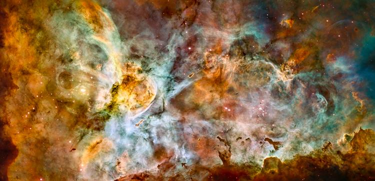 Hubble's view of the Carina Nebula shows star birth in a new level of detail. The fantasy-like landscape of the nebula is sculpted by the action of outflowing winds and scorching ultraviolet radiation from the monster stars that inhabit this inferno. In the process, these stars are shredding the surrounding material that is the last vestige of the giant cloud from which the stars were born. The immense nebula is an estimated 7,500 light-years away in the southern constellation Carina the Keel (of the old southern constellation Argo Navis, the ship of Jason and the Argonauts, from Greek mythology). This image is a mosaic of the Carina Nebula assembled from 48 frames taken with Hubble Space Telescope's Advanced Camera for Surveys. The Hubble images were taken in the light of ionized hydrogen. Colour information was added with data taken at the Cerro Tololo Inter-American Observatory in Chile. Red corresponds to sulfur, green to hydrogen, and blue to oxygen emission.