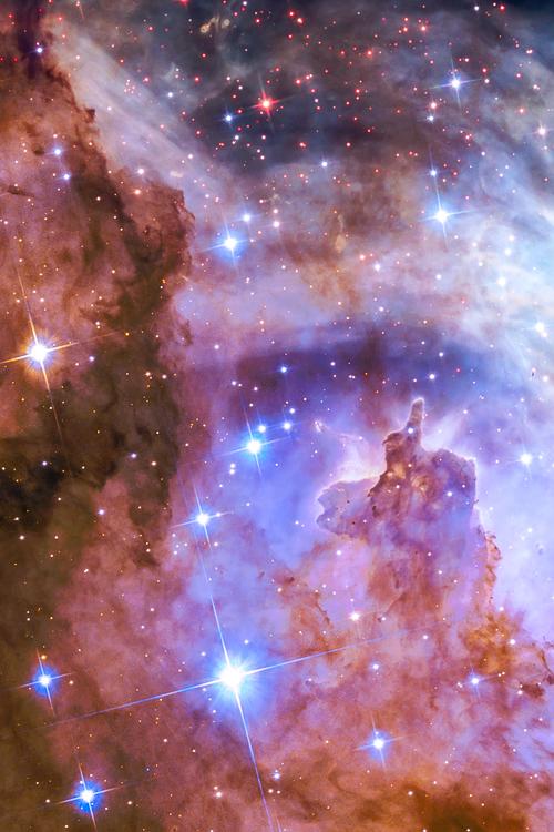 NASA and ESA are celebrating the Hubble Space Telescope's silver anniversary of 25 years in space by unveiling some of nature's own fireworks - a giant cluster of about 3,000 stars called Westerlund 2. The cluster resides inside a vibrant stellar breeding ground known as Gum 29, located 20,000 light-years away in the constellation Carina. The comparatively young, 2-million-year-old star cluster contains some of our galaxy's hottest, brightest, and most massive stars. The largest stars are unleashing a torrent of ultraviolet light and hurricane-force winds that etch away the enveloping hydrogen gas cloud. This creates a fantasy celestial landscape of pillars, ridges, and valleys.