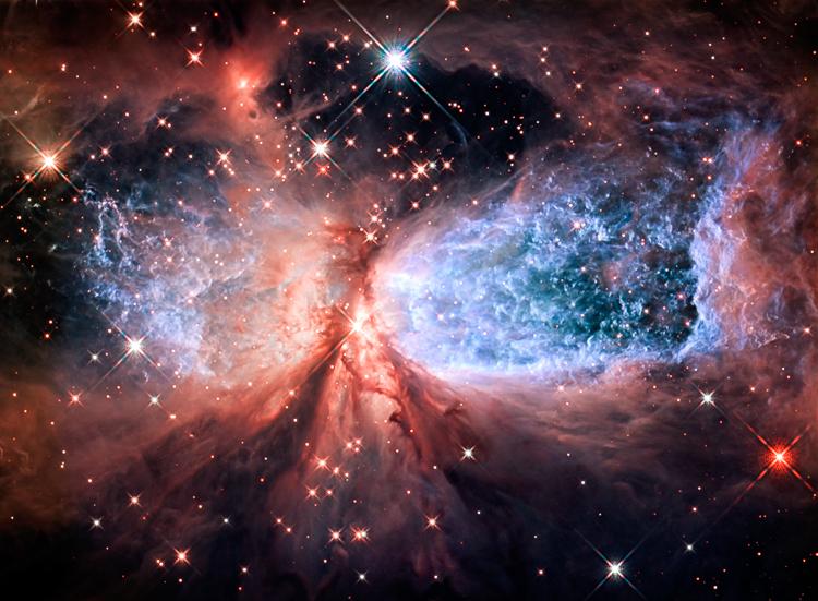 A massive, young star, IRS 4 (Infrared Source 4), is responsible for the furious activity we see in the nebula. Twin lobes of super-hot gas, glowing blue in this image, stretch outward from the central star. This hot gas creates the "wings" of our angel.