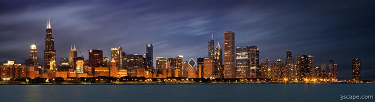 Very high resolution panoramic image of the beautiful and iconic Chicago skyline featuring Willis Tower, Trump Tower, and the John Hancock Building. This is a long exposure, which smooths out the water and abstracts the cloudy sky for an artful look. Amazing as a metal print! Please contact me for larger metal print sizes.