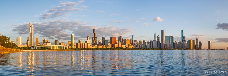 Sunrise on a beautiful summer morning in Chicago, the skyline reflecting in the calm waters of Lake Michigan.