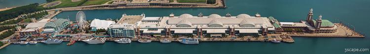 Ultra wide panoramic of Chicago's iconic Navy Pier from the air.