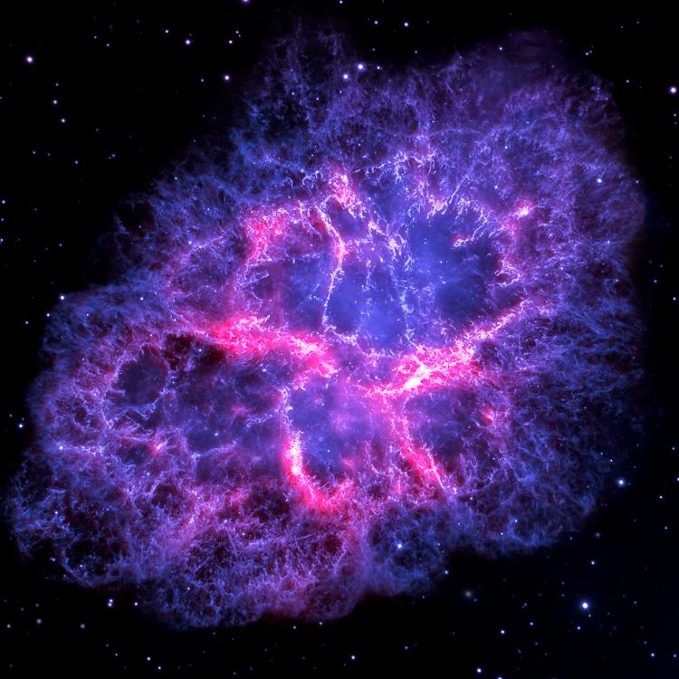 This version of the Crab Nebula image is a composite of the Herschel telescope view in red, and the Hubble view in Blue. The image was then enhanced by Adam Romanowicz.