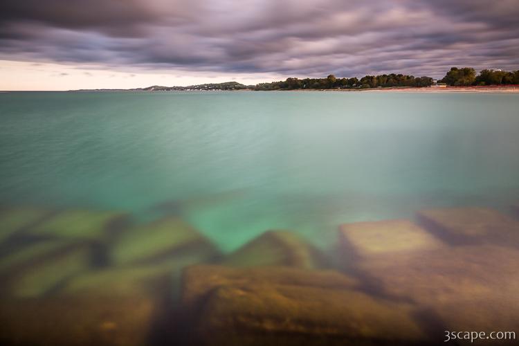 Lake Michigan is incredibly clean in most places. Some summer days, you'd think you were in the Caribbean. This is largely due to the invasive zebra mussels that have taken over the Great Lakes. I created this image to show the beautiful crystal clear blue green water, even when there are waves on the lake. Waves you say? I don't see any waves... This is due to a very long exposure that has smoothed out the water and also softened the clouds. The rocks are part of the North Breakwater of Ludington's Pere Marquette harbor and lighthouse.