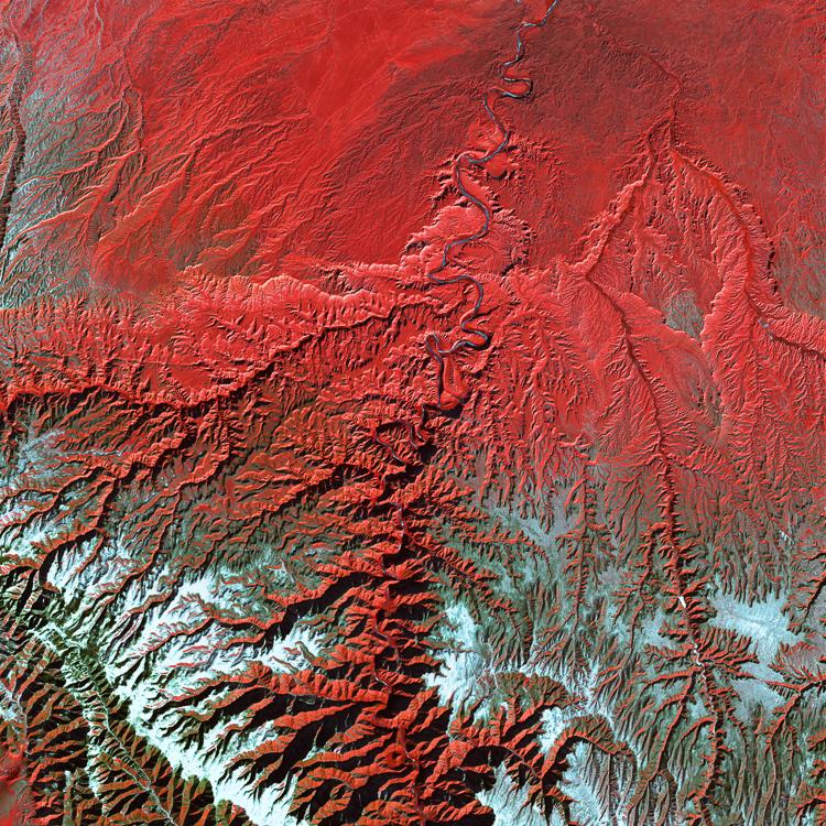 Utah’s Green River flows south across the Tavaputs Plateau (top) before entering Desolation Canyon (center). The Canyon slices through the Roan and Book Cliff--two long, staircase-like escarpments. Nearly as deep as the Grand Canyon, Desolation Canyon is one of the largest unprotected wilderness areas in the American West.