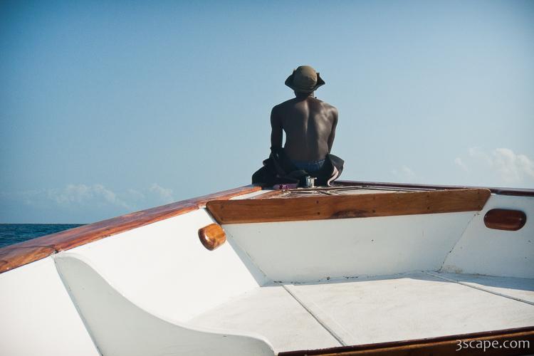 Picture of Dive master riding on the front of our bouncing boat in gallery Zanzibar - Scuba Diving.