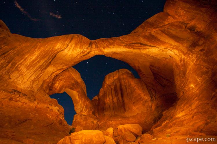 Double Arch at Night, in Arches National Park near Moab, Utah. This is a long exposure using a painting with light technique.