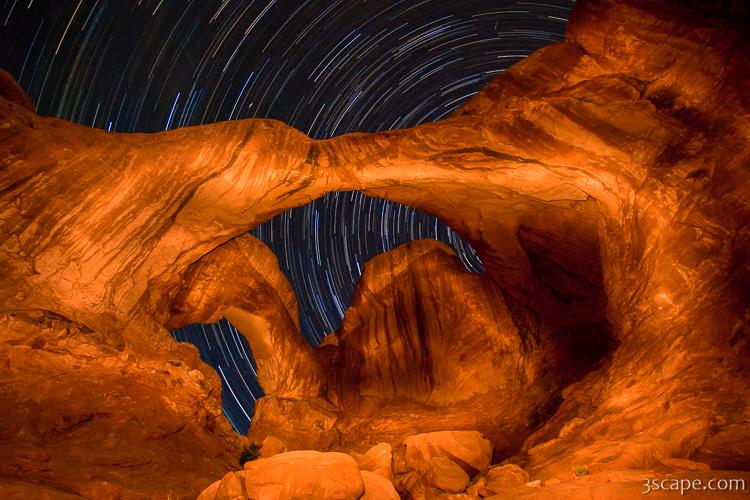 Double Arch at Night, in Arches National Park near Moab, Utah. This is a long exposure using a painting with light technique, capturing star trails in the background.