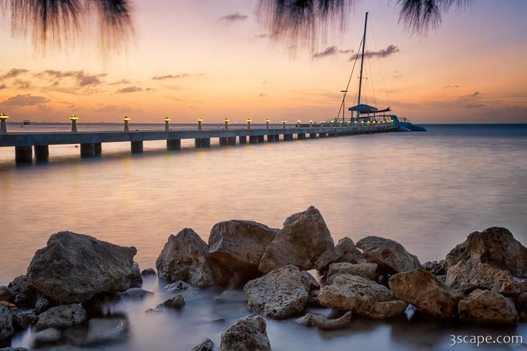 The sun sets on beautiful Grand Cayman island in the Caribbean Sea. This gorgeous view point is from the North Side, at Rum Point Beach. The famous pier stretches to meet a catamaran floating in the North Sound, not far from Stingray City and sand bar.