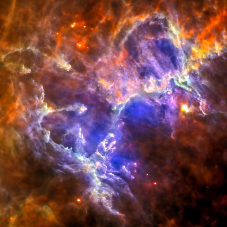 Herschel reveals the nebula's intricate tendril nature, with vast cavities forming an almost cave-like surrounding to the famous pillars, which appear almost ghostly in this view. The gas and dust provide the material for the star formation that is still under way inside this enigmatic nebula.