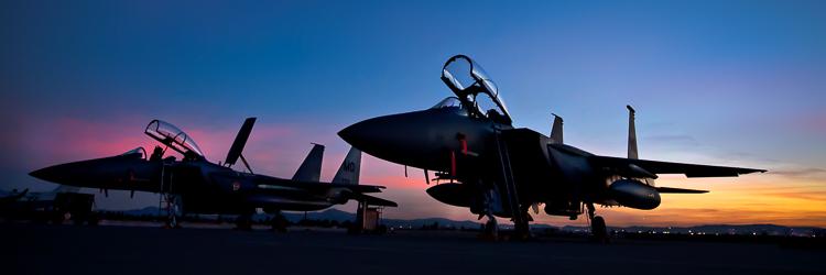 Two F-15E Strike Eagles are parked on the flightline Feb.10, 2014, as the sun sets over Nellis Air Force Base, Nevada. More than 3,200 service members and 125 aircraft from joint U.S. and allied combat forces from around the world participate in Red Flag 14-1, hosted by the 414th Combat Training Squadron. The main objective of the exercise is to increase capabilities to defend against future threats.The F-15Es are assigned to the 391st Fighter Squadron, Mountain Home AFB, Idaho. (U.S. Air Force photo/Lorenz Crespo)