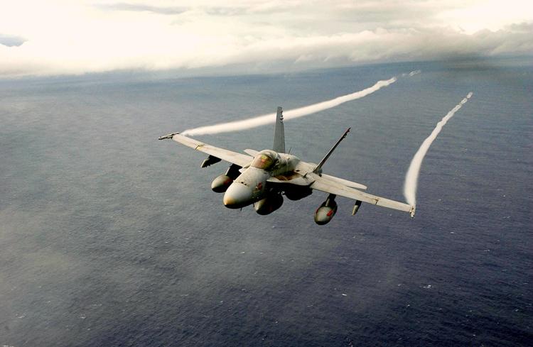 Western Pacific Ocean (Oct. 25, 2003) -- An F/A-18 Hornet assigned to the "Mighty Shrikes" of Strike Fighter Squadron Ninety Four (VFA-94), flies over the Western Pacific Ocean during flight operations aboard USS Nimitz (CVN 68). The Nimitz Carrier Strike Group and Carrier Air Wing Eleven (CVW-11) are deployed to the Western Pacific. U.S. Navy photo by PhotographerÕs Mate 3rd Class Elizabeth Thompson. (RELEASED)