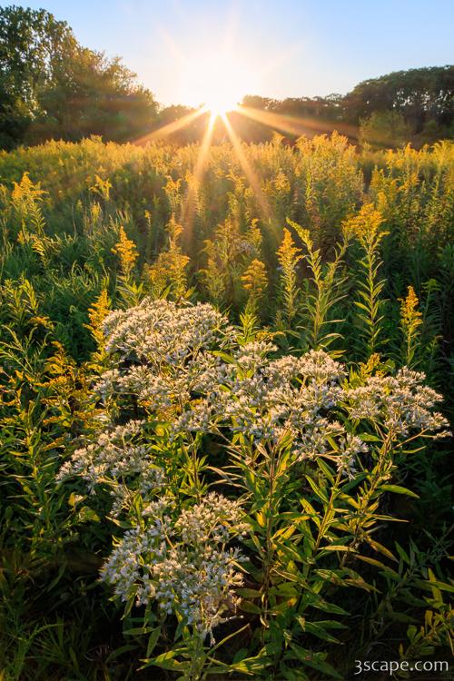 Beautiful Goldenrod and Boneset wildflowers bloom in the late summer sun on Illinois wild prairies. This golden display signals the coming Autumn.
