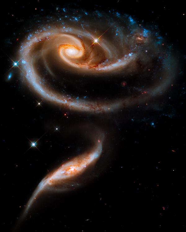 This image of a pair of interacting galaxies called Arp 273 was released to celebrate the 21st anniversary of the launch of the NASA/ESA Hubble Space Telescope. The distorted shape of the larger of the two galaxies shows signs of tidal interactions with the smaller of the two. It is thought that the smaller galaxy has actually passed through the larger one. 4x5 standard format for easy framing.