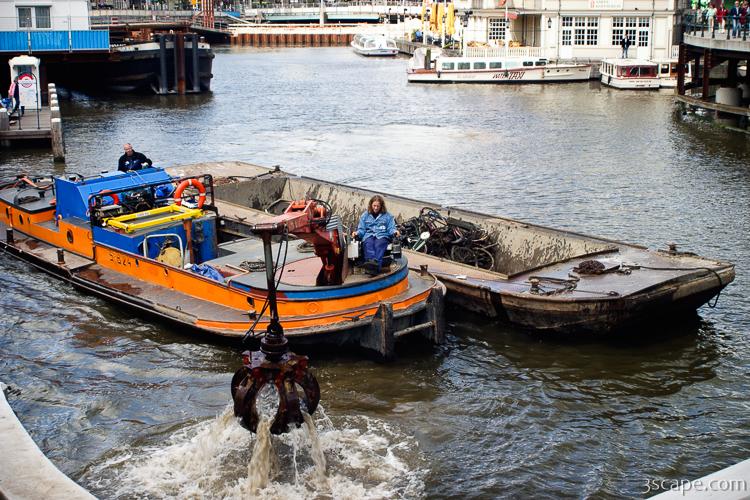 Picture of Garbage picker and barge grabbing bikes from the canal in gallery Amsterdam (Part 1).