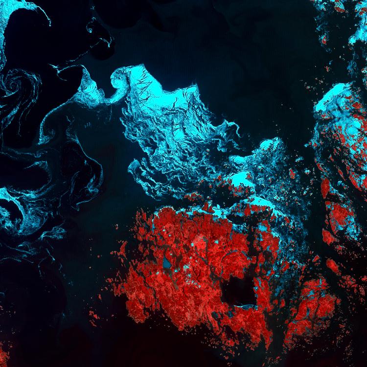 Ethereal swirls of grease ice appear turquoise against the midnight blue of the northern Baltic Sea near the Aland Islands (red) between Finland and Sweden. An early stage of sea ice formation, grease ice consists of a viscous mix of tiny ice crystals and resembles an oil slick on the ocean's surface. Wind and currents constantly shape and reshape grease ice into surreal, ghostly patterns.