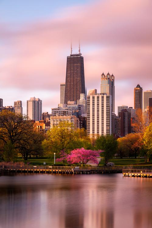 Spring mornings in Chicago, you never know what you're going to get. This morning there was a slick layer of frost on the ground and a nip in the air. However, the sunrise was glorious, and glowed perfectly on this Redbud tree in Lincoln Park. Clouds were moving low and slow over the city, in this moment creating a halo over the John Hancock Center. The slight pinkish color was a side-effect of the neutral density filter I used to allow for such a long exposure.