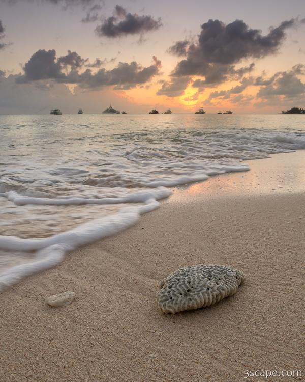 Sunsets in Grand Cayman are colorful and amazing. This was captured near Cemetery Beach, north of Seven Mile Beach on the west side of this beautiful island. Sea shells and bits of coral from the crystal clear waters sometimes wash ashore, in this case providing a perfect photo opportunity before enjoying a beach side dinner. In the distance, private megayacht Vibrant Curiosity is moored along with local dive boats.