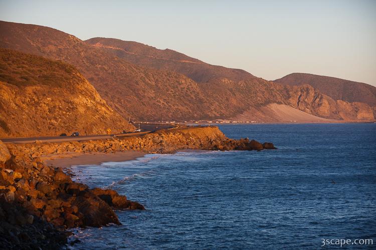 View of Pacific Coast Highway from Point Mugu Rock, with Thornhill Broome Beach and Sandy Dune in the distance.