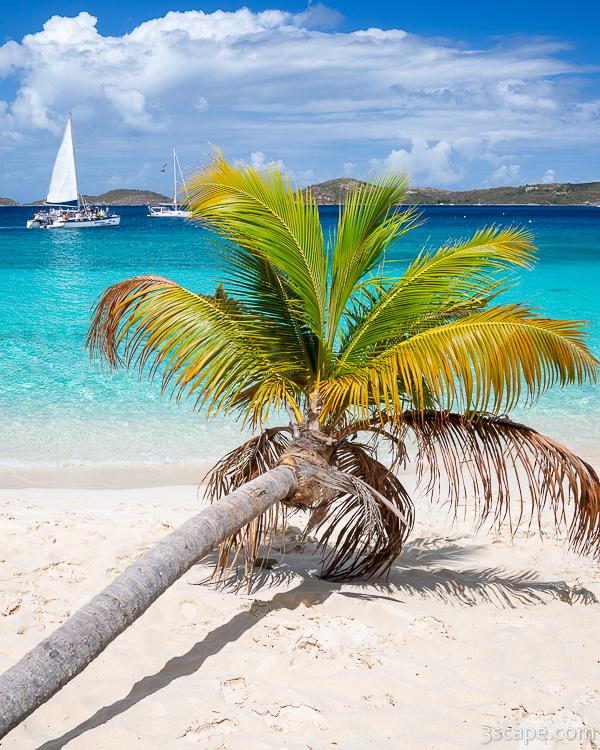 Honeymoon beach is a beautiful, though not easily accessible beach on St. John in the US Virgin Islands. To get to this secluded beach, you have to either come by boat or walk along the Lind Point Trail from Cruz Bay. This beach is one of the few that has surviving palm trees after twin hurricanes in 2017.