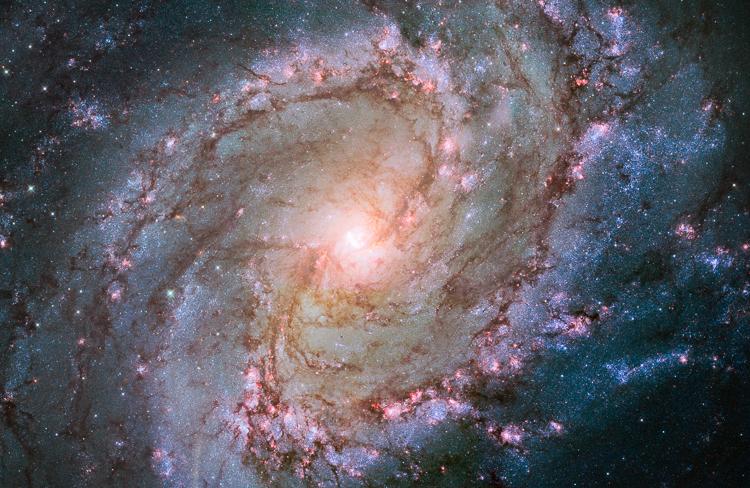 This new Hubble image shows the scatterings of bright stars and thick dust that make up spiral galaxy Messier 83, otherwise known as the Southern Pinwheel Galaxy. One of the largest and closest barred spirals to us, this galaxy is dramatic and mysterious; it has hosted a large number of supernova explosions, and appears to have a double nucleus lurking at its core.