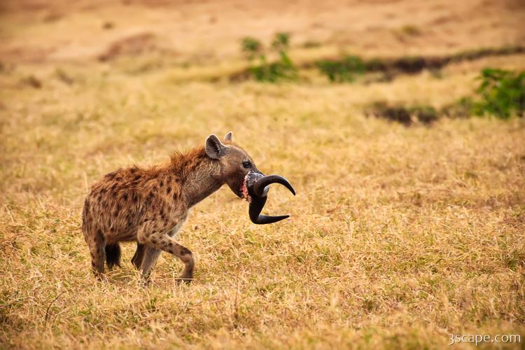 One hyena from the pack running off with his prize, the cap of a wildebeest.