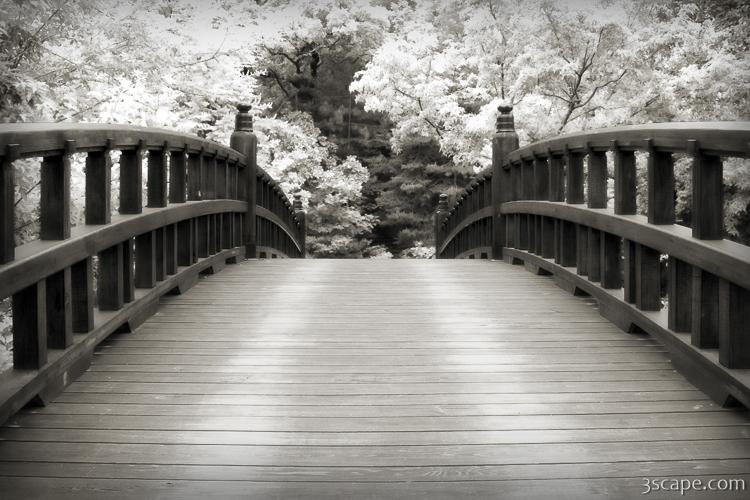 Surreal image of an arch bridge going into a forest in a Japanese Garden. Done in infrared for a unique dreamy feel.