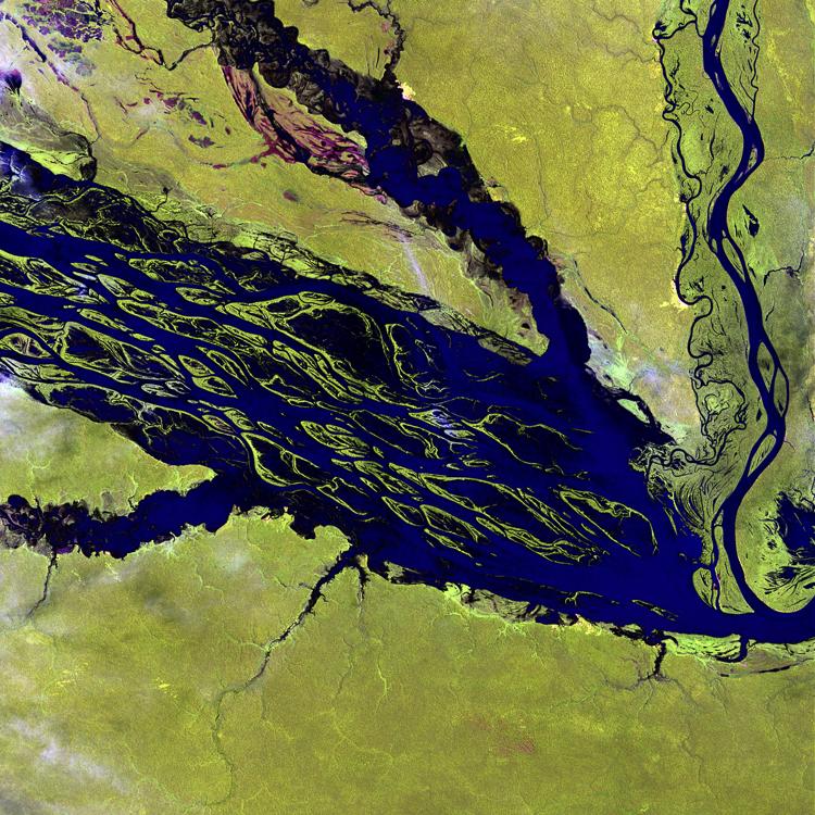 Fed by multiple waterways, Brazil's Negro River is the Amazon River's largest tributary. The mosaic of partially-submerged islands visible in the channel disappears when rainy season downpours raise the water level.