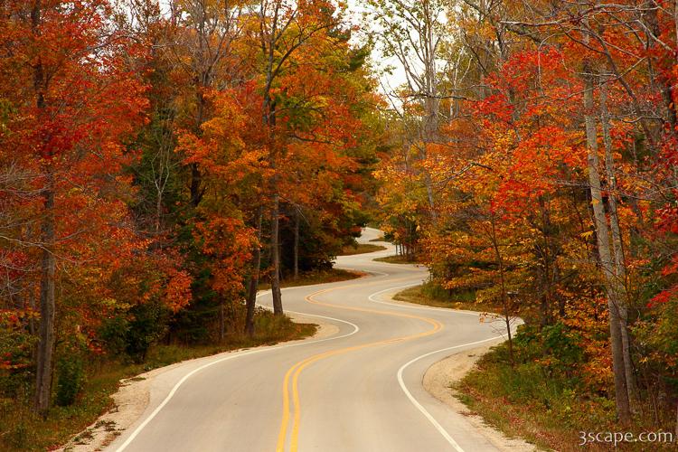 Brilliant fall colors along a road winding its way through Door County Wisconsin. This is also known as Jens Jensen's Winding Road, Highway 42 near Northport. Door County is a popular vacation and tourist destination, especially for residents of Wisconsin and Illinois, especially during autumn, when there are numerous fall festivals in the quaint small towns (Fish Creek, Egg Harbor, Sister Bay, Ephraim, Ellison Bay).