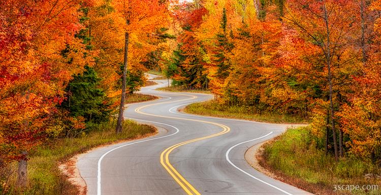 Brilliant fall colors along a road winding its way through Door County Wisconsin. This is also known as Jens Jensen's Winding Road, Highway 42 near Northport. Door County is a popular vacation and tourist destination, especially for residents of Wisconsin and Illinois, especially during autumn, when there are numerous fall festivals in the quaint small towns (Fish Creek, Egg Harbor, Sister Bay, Ephraim, Ellison Bay).