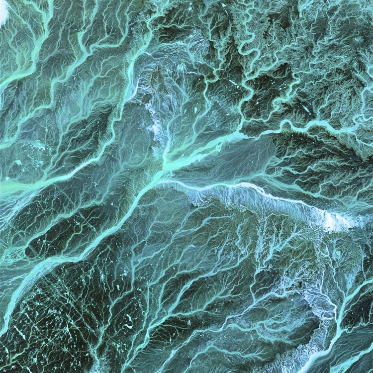 Meandering wadis combine to form dense, branching networks across the stark, arid landscape of southeastern Jordan. The Arabic word "wadi" means a gulley or streambed that typically remains dry except after drenching, seasonal rains.