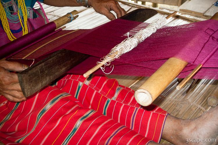 Picture of Karen tribe woman making a silk scarf in gallery Chiang Mai.