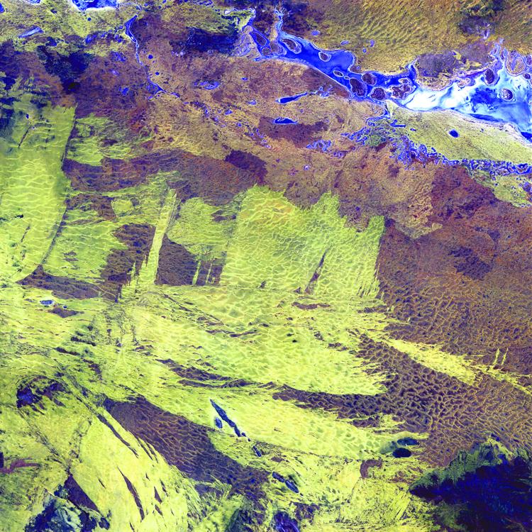 Like frantic brushstrokes, fire scars cover the arid landscape near Lake Amadeus (upper right) in Australia's Northern Territory. Lake Amadeus is rich in salts that have been leached out of underlying sediments. When dry, its lake bed is transformed into a glistening sheet of white salt crystals.