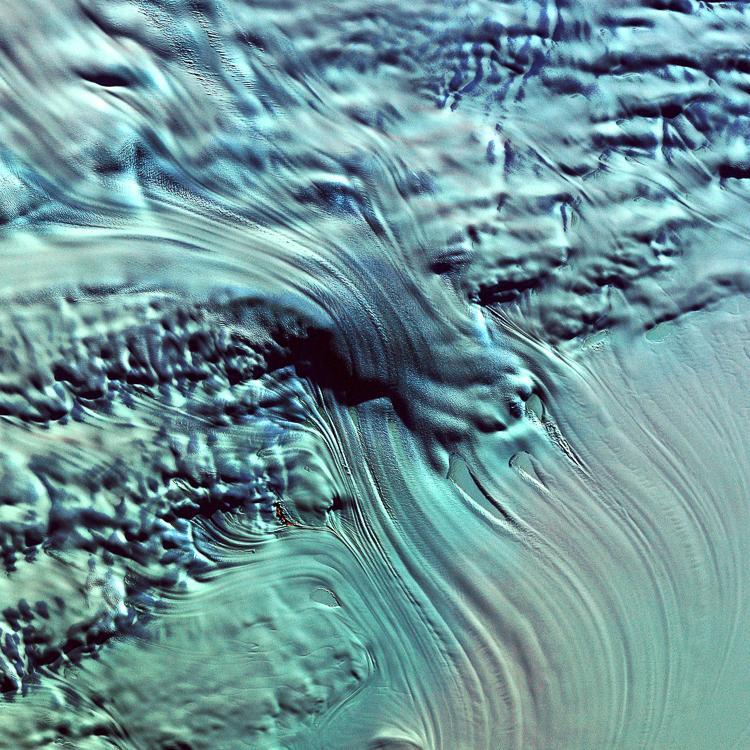 The Lambert Glacier in Antarctica is the world's largest glacier. The focal point of this image is an icefall that feeds into the glacier from the vast ice sheet covering the polar plateau. Ice flows like water, albeit much more slowly. Cracks can be seen in this icefall as it bends and twists on its slow-motion descent 1300 feet (400 meters) to the glacier below.